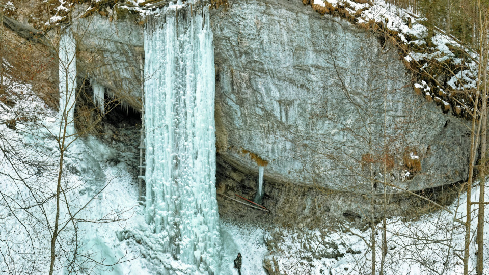 Der Eisfall besteht aus zwei Teilen – aus einem mit etwa 23 und einem mit rund 18 Metern Höhe. Die Naturfreunde Breitenau investieren in den Eisfall „Alice“ enorm viel Zeit und Engagement. Denn hinter den imposanten Eiswänden steckt viel Handarbeit: Baumstämme und Stahlseile bilden ein stabiles Gerüst, auf dem sich der Eisaufbau gleichmäßig entwickeln kann. Sobald die Temperaturen konstant unter null liegen, beginnt die tägliche Arbeit am Eis. Das Wasser wird gezielt über die vorbereiteten Strukturen geleitet, damit sich gleichmäßig starke Eisschichten bilden. Während der Frostperioden muss die Wasserführung mindestens zweimal täglich kontrolliert werden. Nur so kann ein sicherer Aufbau gewährleistet werden – eine mühsame, aber lohnende Arbeit, die jedes Jahr aufs Neue große Freude bereitet.