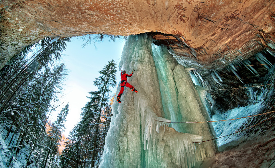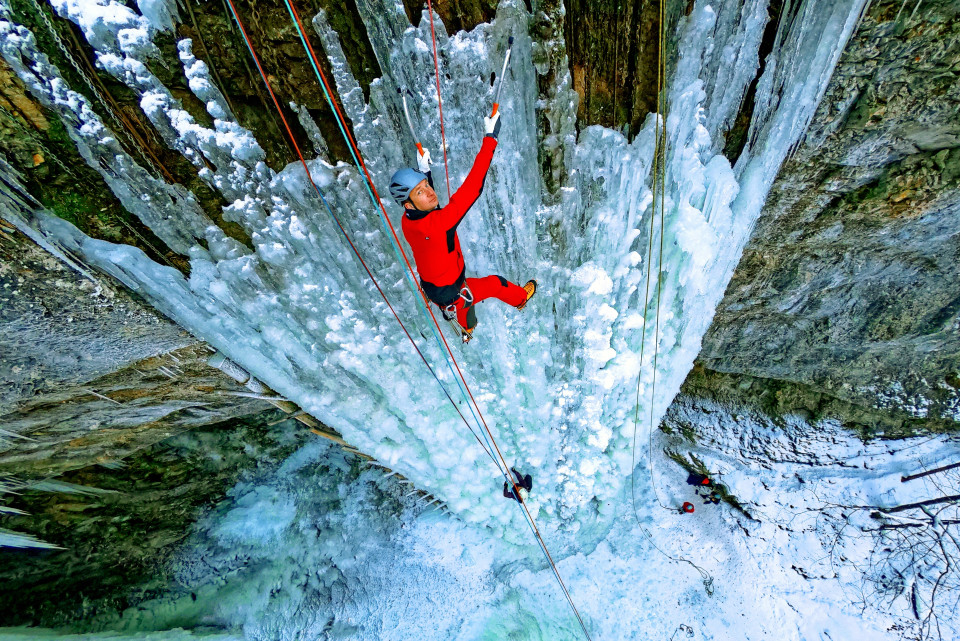 Mit Steigeisen, Eisgeräten und Helm ausgestattet, steigen Eiskletterinnen und Eiskletterer senkrecht oder überhängend an vereisten Felswänden empor. Jeder Schlag des Eisgeräts, jeder Tritt im glitzernden Eis muss sitzen – denn Stabilität und Sicherheit hängen von Fingerspitzengefühl und Erfahrung ab.